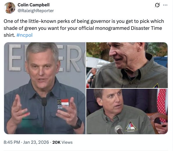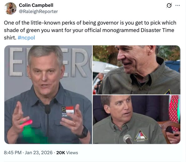 First, the weather. I’m writing this as the ice comes down steadily across the state. Ahead of the storm, Gov. Josh Stein did the traditional pre-storm press conference at the Emergency Operations Center. If you’ve lived here long enough, you already know what he was wearing for it.