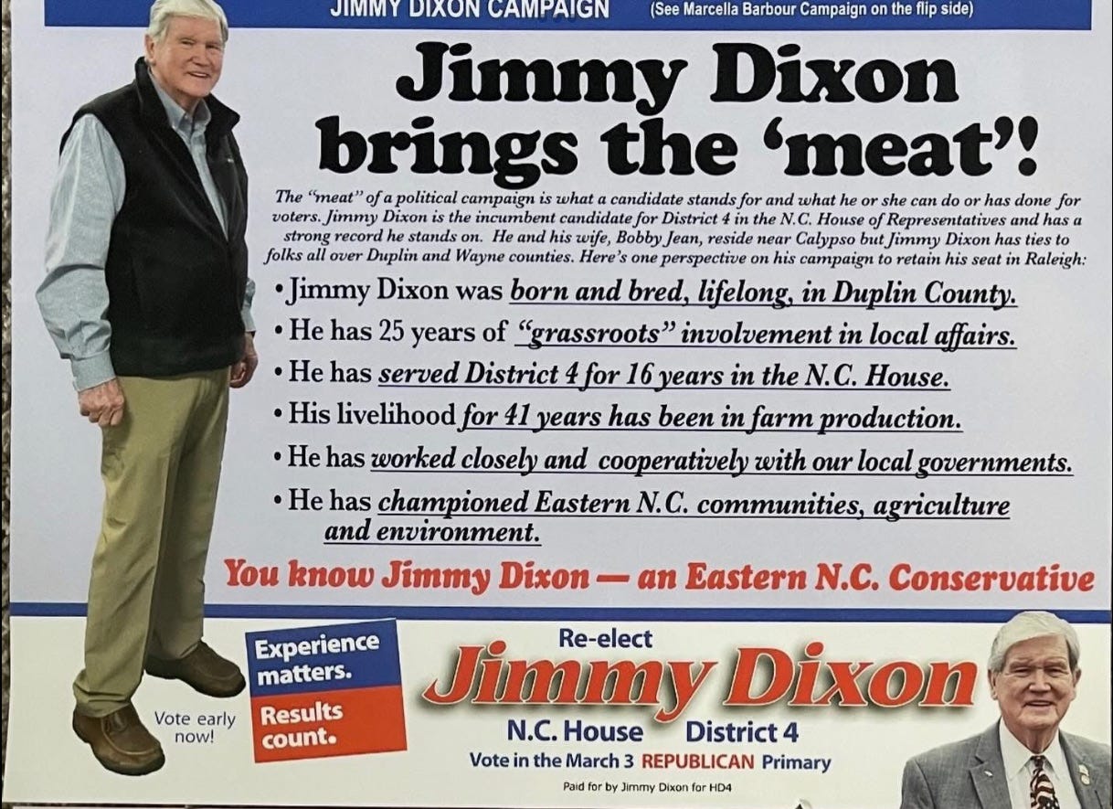 Speaking of unpolished, my favorite ad of the primary season is solidly in that category as well. Eastern N.C. legend Rep. Jimmy Dixon sent out this mailer as he faced Marcella Barbour.